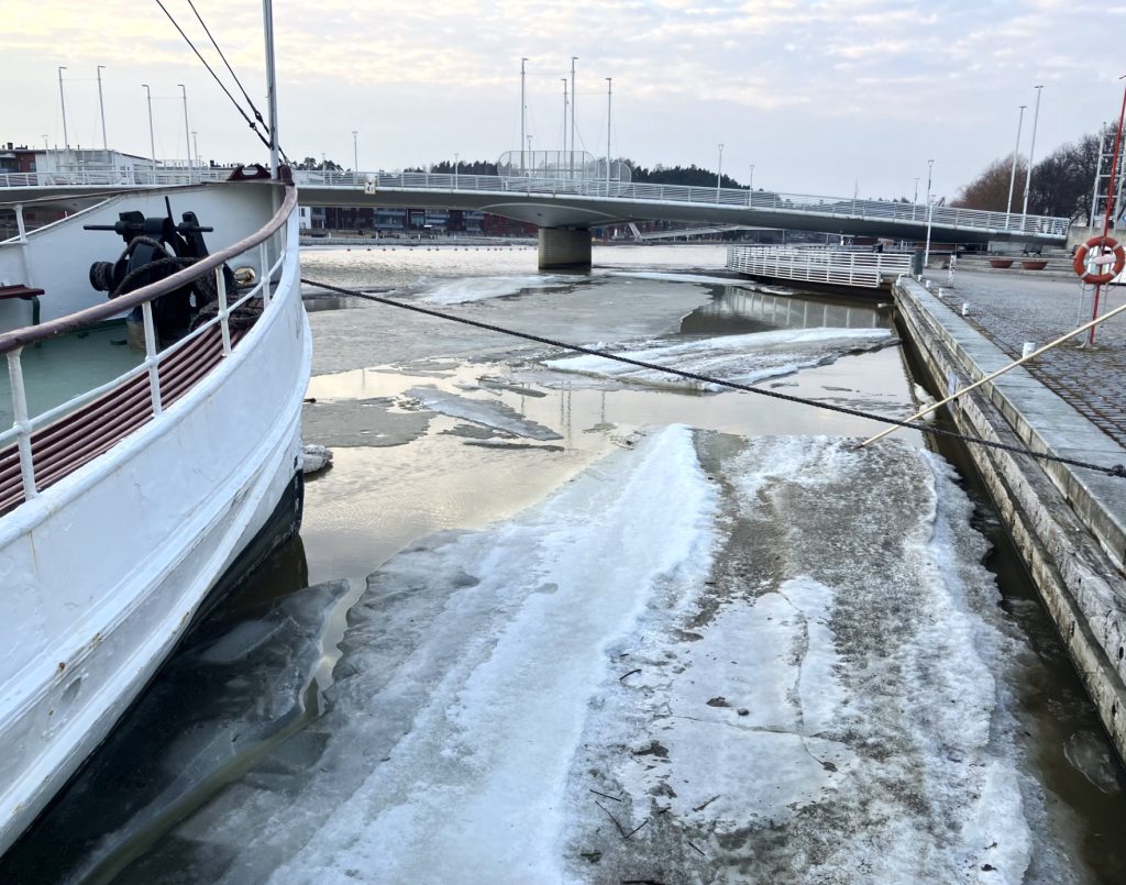 The pictures are from last week, a day before the ice melted. The ice was still so thick that the ship couldn’t be pulled closer to shore. Pictures: Meri Valtiala.