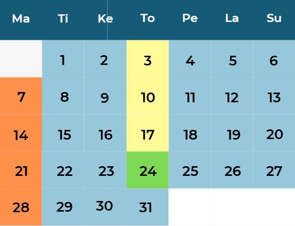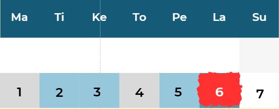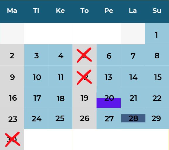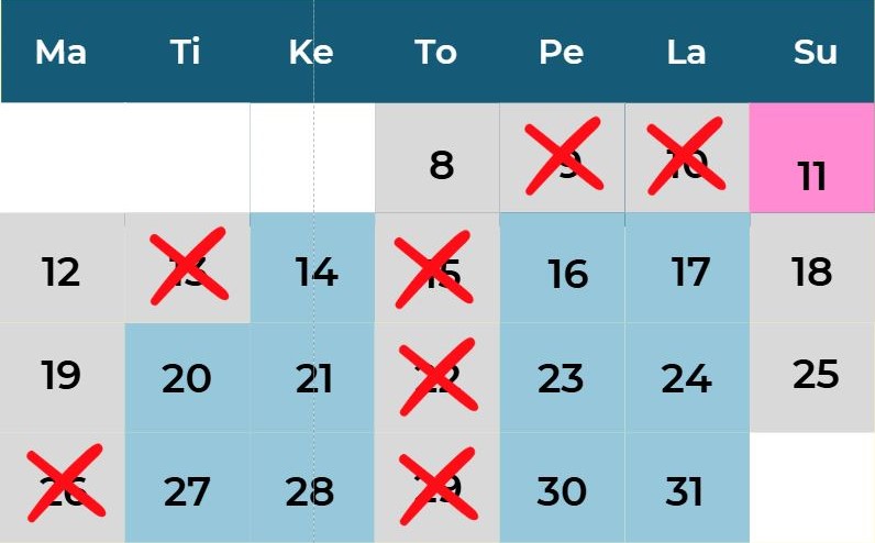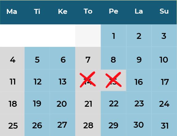 Regular route Helsinki−Porvoo−Helsinki: days marked blue in the calendar